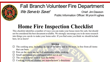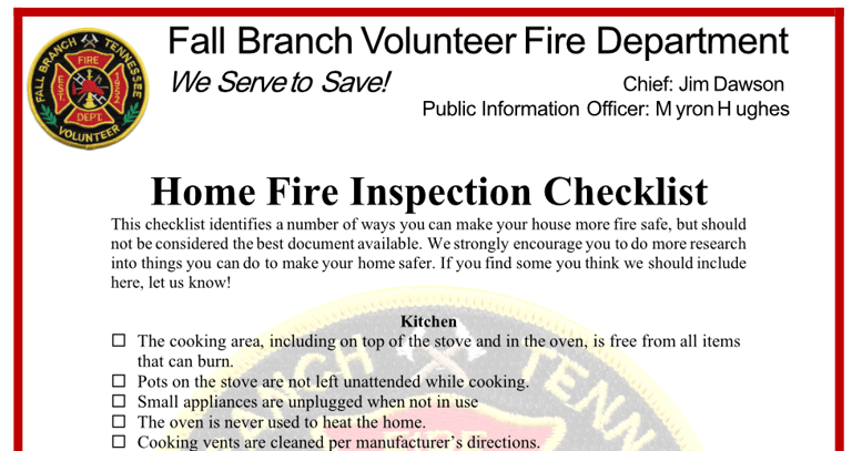 We do not offer home fire inspections, but we have developed a checklist that includes many things that need to be considered to make your home more fire safe. Click the image below to download the document.