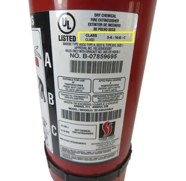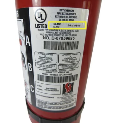 When choosing a portable extinguisher for your home, as a general rule, it should have a rating of at least 2-A:10B, meaning that it is capable of extinguishing both Class A and B fires. Ratings that also include a ‘C’ are capable of extinguishing Class C fires. This label gives an example of a rating on an extinguisher: